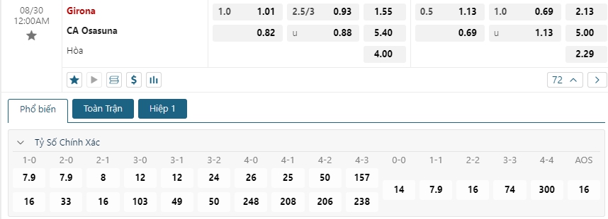 Kèo Châu Âu vẫn đang là ưu thế cho các cầu thủ chủ nhà khi mức ăn của họ là 1.5 , trong khi mức ăn của các vị khách Osasuna đang là 5.40, Ưu thế sân nhà, lực lượng được đánh giá cao, cùng với đó lịch sử đối đầu ủng hộ là cơ sở để đặt niềm tin vào chiến thắng cho các cầu thủ Girona.