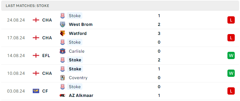Bên kia, sau khởi đầu như mơ bằng chiến thắng tối thiểu trước đối thủ khó chịu Coventry ở trận ra quân, Stoke City lại không thể duy trì được phong độ khi họ đã thua 2 trận liên tiếp. Hai thất bại liên tiếp vừa qua đã chỉ ra một thực tế rằng, lối chơi của Stoke vẫn còn thiếu sự chắc chắn và ổn định. Hàng thủ của họ bộc lộ nhiều sơ hở, trong khi hàng công chưa thể tận dụng tốt các cơ hội. Điều này đặt ra thách thức lớn cho Stoke City khi họ bước vào trận đấu với Plymouth Argyle.