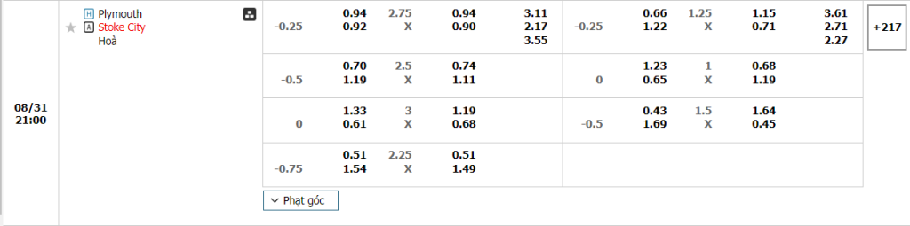Bảng tỷ lệ kèo bóng đá trận đấu Plymouth Argyle vs Stoke City
