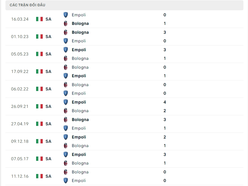 Lịch sử thi đấu của Bologna vs Empoli