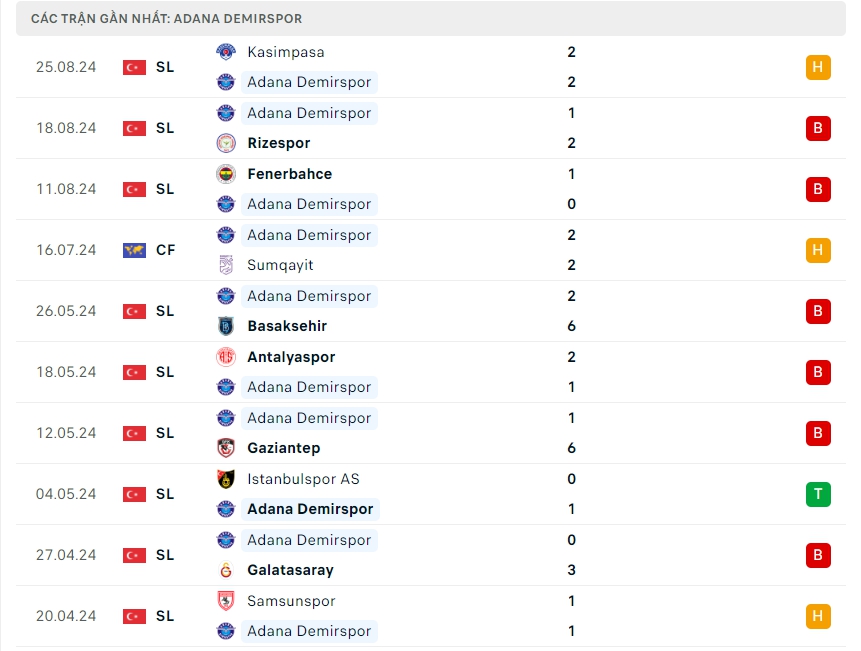 Phong độ đội bóng Adana Demirspor vs Galatasaray