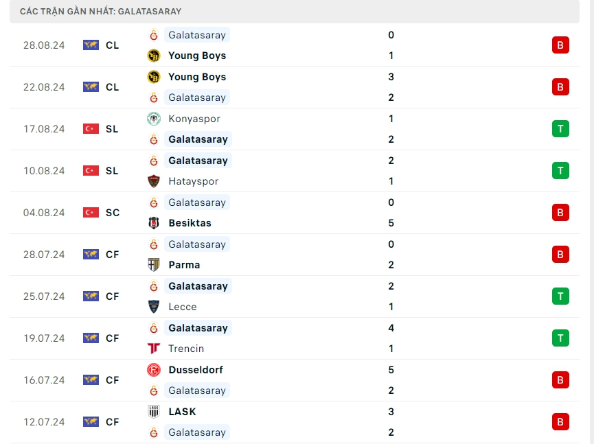 Trong khi đó với Galatasaray họ vừa nhận thất bại trước Young Boys ở sân chơi vòng loại Champions League, còn ở đấu trường quốc nội Galatasaray vừa có chiến thắng trước Konyaspor, đây là trận thắng thứ 2 của họ sau 2 lượt trận, với 6 điểm có được các vị khách đang xếp vị trí thứ 4 trên BXH, nhưng đang đá ít hơn các đối thủ xếp phía trên 1 trận, hàng công của Galatasaray mang về 4 bàn thắng, cùng hàng thủ nhận 2 bàn thua, khi thi đấu xa nhà Galatasaray đang chơi tốt với 11 bàn thắng, tuy vậy hàng thủ cũng nhận 13 bàn thua, cả 5 trận đấu đó đều khép lại tưng bừng bàn thắng.