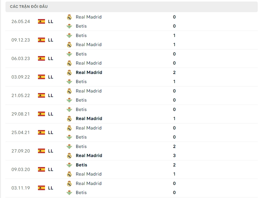 Lịch sử thi đấu của Real Madrid vs Real Betis
