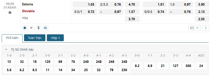 Kèo Châu Âu vẫn đang là sự vượt trội dành cho các vị khách khi mức ăn của họ là 1.57 và con số này của các cầu thủ chủ nhà Estonia đã là 4.70. Dù phải thi đấu xa nhà, nhưng với phong độ cùng thực lực được đánh giá cao, cộng với đó là ưu thế trong những lần đối đầu là cơ sở để đặt niềm tin vào các cầu thủ Slovakia trong trận đấu này.