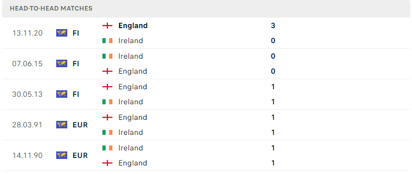 Thành tích đối đầu của Ireland vs Anh