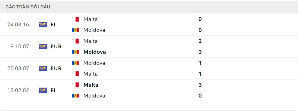 Lịch sử thi đấu của Moldova vs Malta