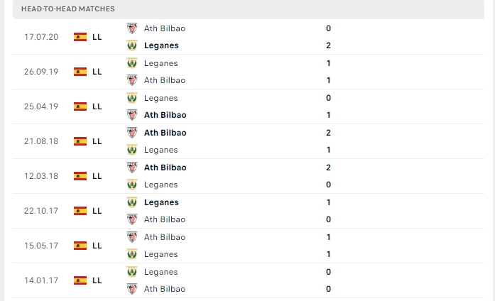 Ở lần gặp nhau gần nhất trong mùa giải năm ngoái, Athletic Bilbao dù được đánh giá cao hơn nhưng cũng không thể đánh bại Leganes khi khép lại với kết quả hòa 1-1. Sẽ một lần nữa Athletic Bilbao là những người mang đến những thử thách không nhỏ dành cho chủ nhà Leganes, tuy vậy để tìm kiếm chiến thắng là điều không hề dễ dàng.