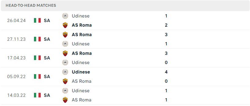 Thành tích đối đầu của Roma vs Udinese