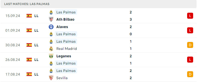 Bên phía kia, Las Palmas lại đang trình diễn một phong độ cực kỳ nghèo nàn, sau 5 vòng đấu binh đoàn áo vàng chưa mang về được bất kỳ chiến thắng nào cũng như đã nhận về đến 3 thất bại. Còn nhớ, ở mùa giải trước Las Palmas cũng suýt phải nói lời chia tay La Liga và ở mùa giải này họ đang có dấu hiệu tiếp tục đi vào vết xe đổ. Một mùa giải khó khăn khi dàn nhân sự có nhiều sự xáo trộn và điều này bắt buộc thầy trò Luis Carrión cần phải mạnh mẽ hơn nữa trong tương lai.