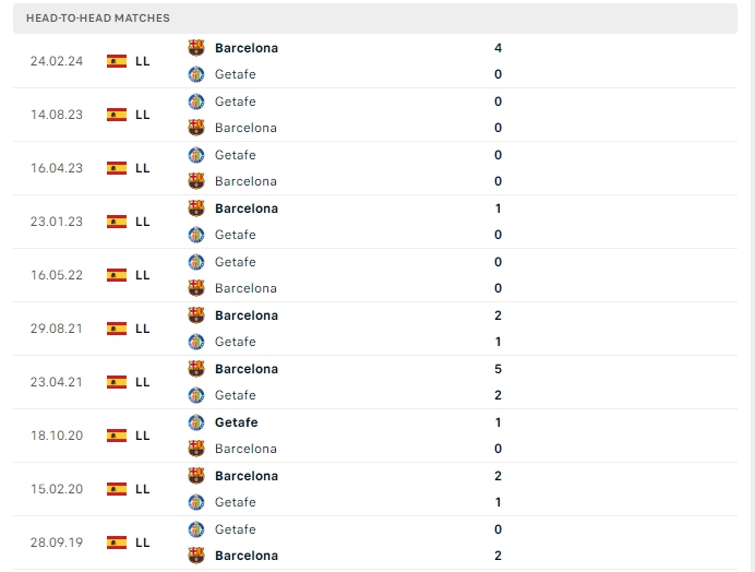 Lịch sử thi đấu của Barcelona vs Getafe