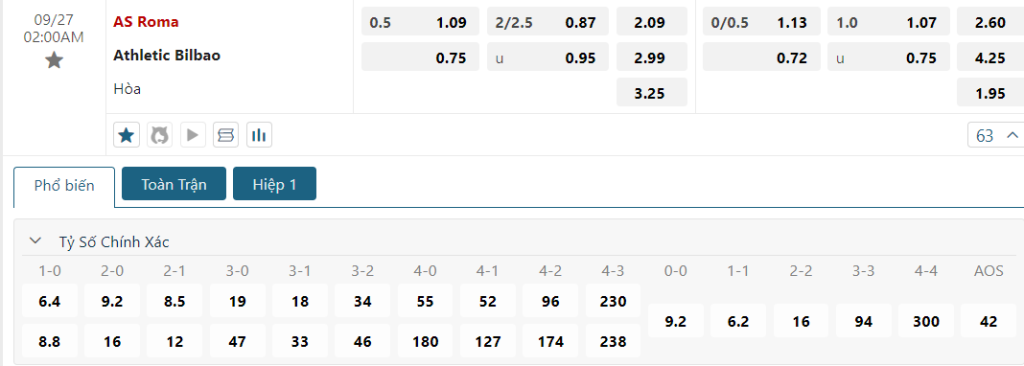 Kèo Châu Âu hiện vẫn đang nghiêng về phía AS Roma, khi mức ăn của họ là 2.09, trong khi con số này của các vị khách là 2.99. Sự chênh lệch này cho thấy nhà cái tin tưởng vào khả năng giành chiến thắng của Roma, mặc dù đội bóng này đang gặp khó khăn trong thời gian gần đây. Dẫu phong độ của Ath Bilbao là không hề tồi, nhưng chính việc phải làm khách sẽ kiềm hãm sức mạnh của họ.