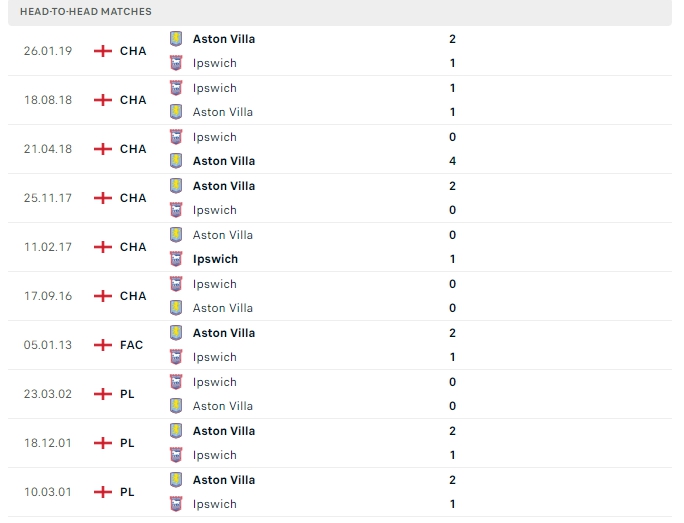 Lịch sử thi đấu của Ipswich vs Aston Villa