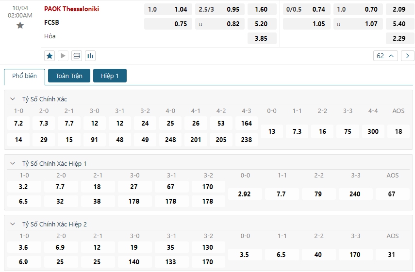 Kèo châu Âu vẫn đang là sự ưu thế lớn cho chủ nhà khi mức ăn của PAOK đang là 1.60 trong khi đó con số này của Steaua Bucuresti là 5.20,  Dù có ưu thế sân nhà và được đánh giá cao hơn nhưng với phong độ không tốt cùng với đó là sự hưng phấn đến từ các vị khách sau màn trình diễn tốt thời gian qua thì PAOK hứa hẹn sẻ gặp không ít khó khăn và nhiều khả năng chỉ có 1 điểm ra về.
