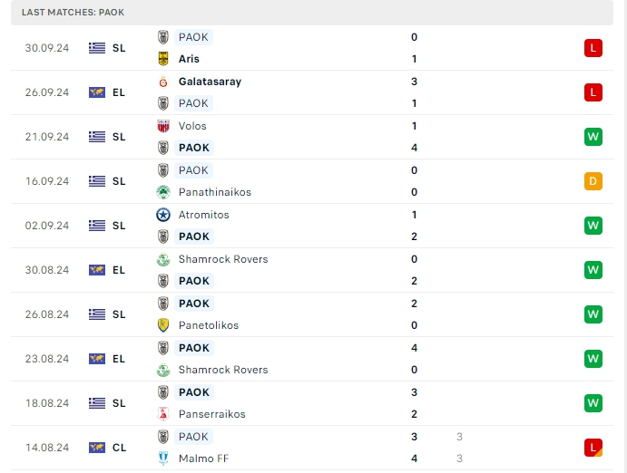PAOK gây thất vọng ở lượt trận đầu tiên của đấu trường Europa League khi nhận thất bại 1-3 trước Galatasaray và ngay sau đó khi trở về giải đấu quốc nội, họ cũng có cho mình thất bại trước Aris, dù trước đó họ trải qua chuỗi phong độ ấn tượng kéo dài, hàng công của PAOK mang về8 bàn thắng ở 5 trận đấu gần nhất, trong đó 3/5 trận khép lại 90 phút từ 3 bàn thắng trở lên, trên sân nhà của mình PAOK 9 bàn thắng cùng hàng thủ nhận 3 bàn thua, 3 trận gần nhất trên sân nhà của PAOK khép lại không quá 2 bàn.