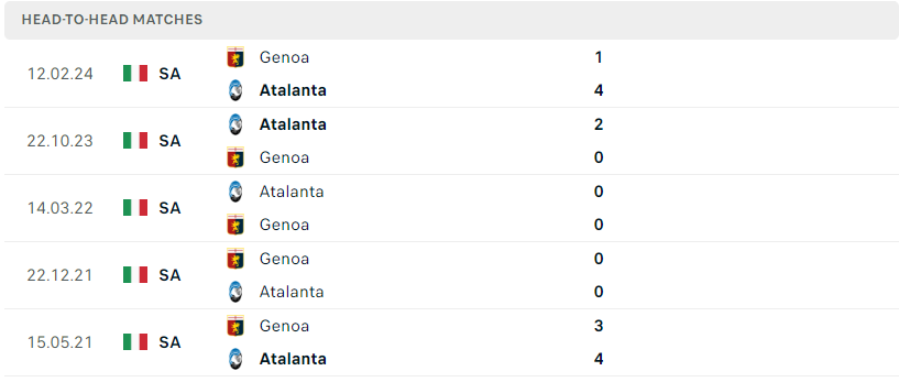 Lịch sử thi đấu tiếp tục là sự áp đảo dành cho Atalanta, khi tập thể này đã hoàn toàn bất bại trong 5 cuộc chạm trán gần nhất và đáng nói trong số này họ đã có đến 3 lần giành chiến thắng. Hai chiến thắng thuyết phục ở mùa giải trước đã cho thấy rõ phần nào sự kỵ rơ và sự vượt trội của Atalanta. Trong thời điểm mọi thứ đang quá tồi tệ với Genoa thì họ hoàn có thể phải đối mặt với kịch bản tương tự.