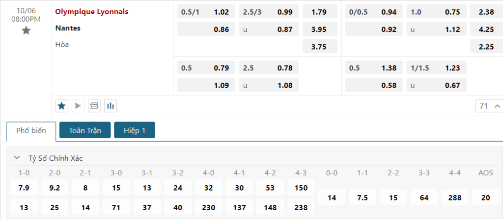 Kèo Châu Âu vẫn đang là sự nhỉnh hơn dành cho Lyon, khi mức ăn của họ là 1.79 và con số này của các vị khách là 3.95. Điều này cho thấy, các nhà cái tin tưởng vào khả năng giành chiến thắng của đội chủ nhà trong cuộc đối đầu này. Lyon, với lợi thế sân bãi và đội hình mạnh mẽ, được đánh giá cao hơn, trong khi Nantes sẽ phải nỗ lực rất nhiều nếu muốn tạo ra bất ngờ.
