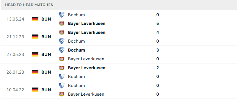 Thành tích đối đầu của Bochum vs Bayer Leverkusen