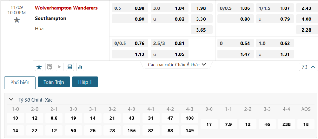 Kèo Châu Âu hiện vẫn đang là sự nhỉnh hơn dành cho đội chủ nhà, tuy nhiên sự chênh lệch giữa hai mức ăn cũng là không quá đáng kể (1.98 so với 3.30 của các vị khách). Điều này cho thấy, Southampton vẫn đang được đánh giá rất cao ở cặp trận này. Với sự khởi sắc trở lại cộng kèm với lối đá bết bát và kém hiệu quả Wolves, khả năng cao The Saints sẽ tiếp tục có được 3 điểm.