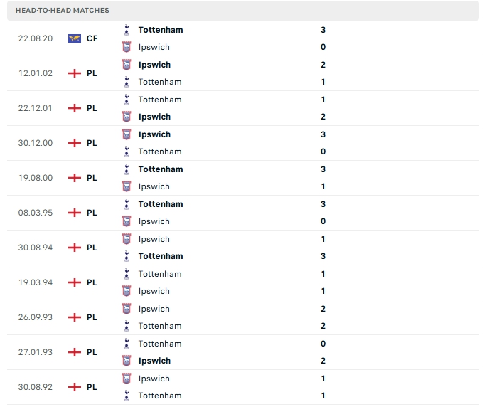 Lịch sử thi đấu của Tottenham vs Ipswich