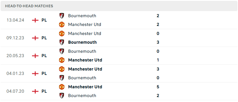 Thành tích đối đầu của Manchester Utd vs Bournemouth