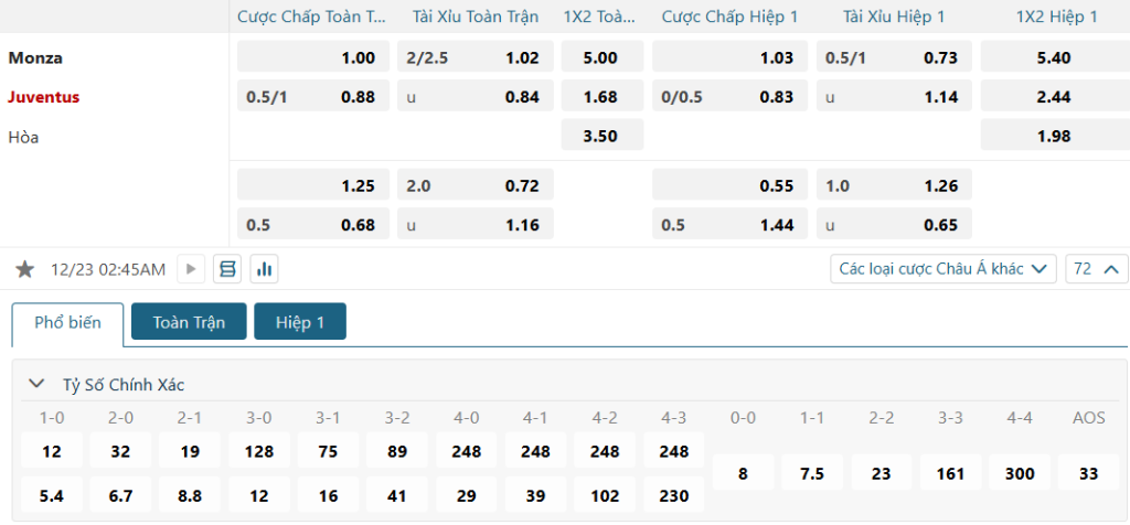 Soi kèo Châu Á, kèo chấp Monza vs Juventus