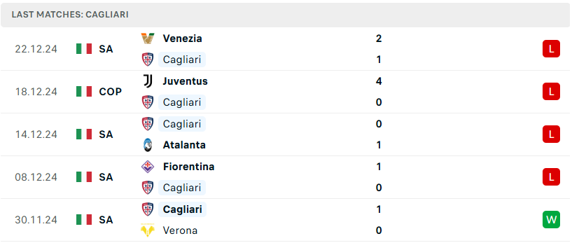 Tưởng chừng như chiến thắng tối thiểu trước Verona vào cuối tháng 11 sẽ giúp Cagliari tìm lại phần nào sự tự tin và trở lại cuộc đua, nhưng mọi chuyện không hề dễ dàng như vậy. Ngay sau đó, họ phải nhận liên tiếp 4 thất bại. Tính rộng hơn, ở 10 trận gần nhất, Cagliari chỉ có đúng 1 chiến thắng. Mùa giải năm nay thật sự khó khăn với họ khi không chỉ lối chơi thiếu hiệu quả mà phong độ cũng tụt dốc thảm hại. Nếu không sớm tìm ra giải pháp, viễn cảnh tồi tệ hơn rất có thể sẽ xảy ra.