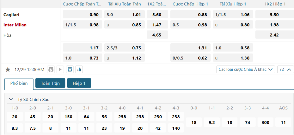 Soi kèo Châu Á, kèo chấp Cagliari vs Inter Milan