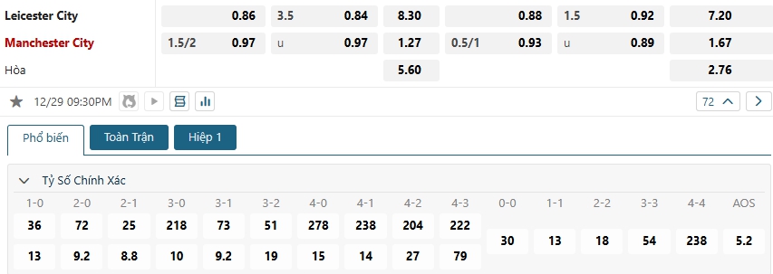 Bảng tỷ lệ kèo bóng đá trận đấu Leicester City vs Manchester City
