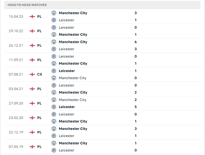 Ở lần gặp nhau gần nhất trên sân King Power Stadium khép lại với chiến thắng tối thiểu 1-0 cho các cầu thủ Man City, và lần đối đầu lần này dù đang gặp khó nhưng Man City vẫn sẻ là đội bóng có được chiến thắng sau cùng.