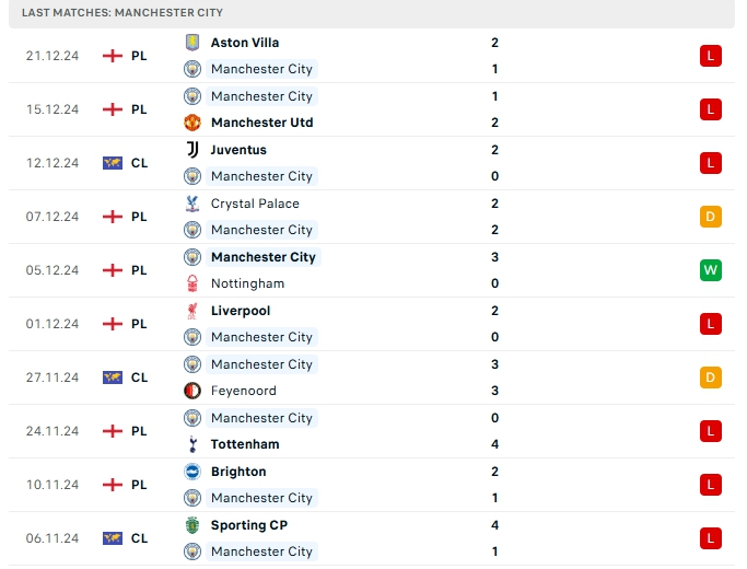 Bên phần sân đối diện, Manchester City đang rơi vào hoàn cảnh đầy khó khăn, thất bại 1-2 trước Aston Villa nối dài chuỗi phong độ kém cỏi của The Citizens vừa qua, sau 12 lượt trận gần nhất họ chỉ có đúng 1 chiến thắng và sau 17 trận đấu, đoàn quân của HLV Pep chỉ mang về 8 chiến thắng, 3 hòa và 6 thất bại, có được 27 điểm và đang xếp vị trí thứ 7 trên BXH, hàng công của Manchester City có cho mình 29 bàn thắng cùng hàng thủ nhận 25 bàn thua, 4/5 trận vừa qua của Manchester City vượt mốc 3 bàn, khi thi đấu xa nhà Manchester City có được 13 bàn thắng cùng hàng thủ nhận 13 bàn thua sau 9 trận, 4/5 trận xa nhà vừa qua của Manchester City chạm mốc 3 bàn.