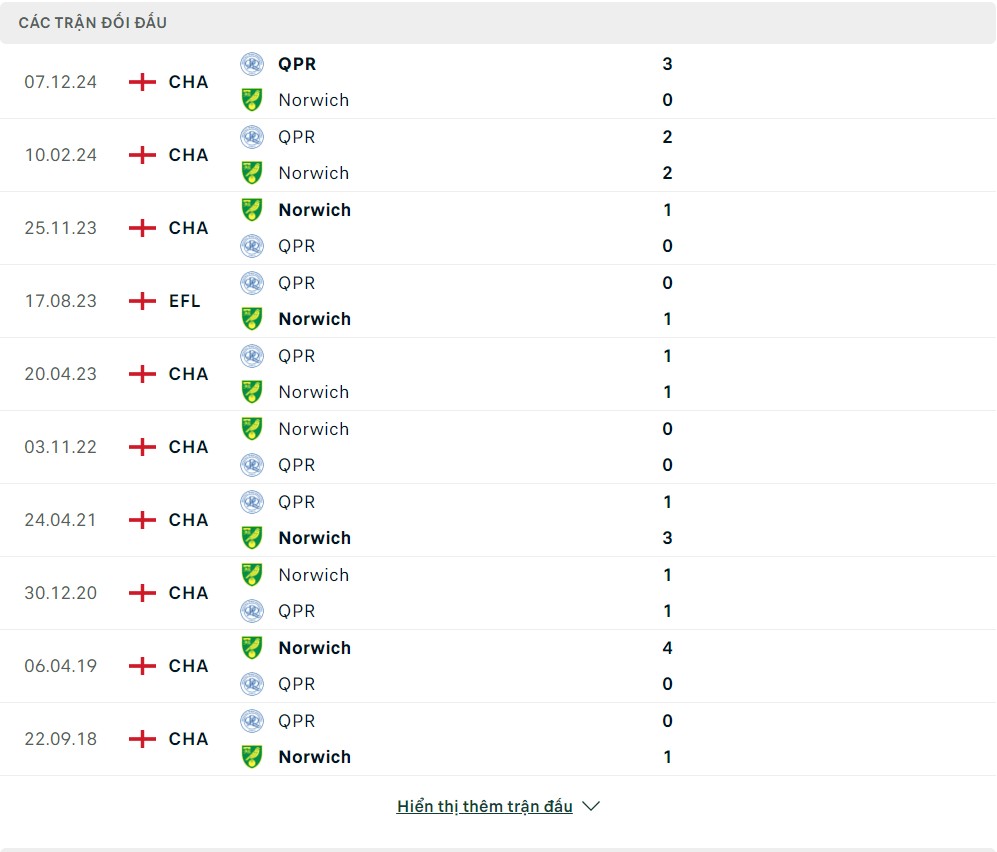 Lịch sử thi đấu của Norwich vs Queens Park Rangers