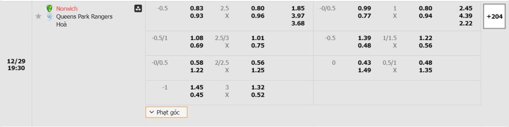 Bảng tỷ lệ kèo bóng đá trận đấu Norwich vs Queens Park Rangers