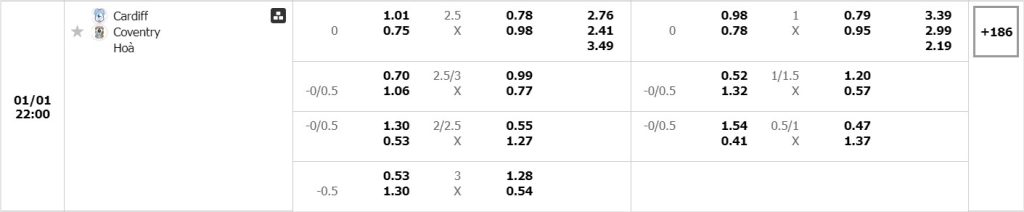 Kèo Châu Âu cho thấy sự cân bằng gần như tuyệt đối khi tỷ lệ cho chiến thắng của chủ nhà Cardiff City là 2.76 trong khi con số này bên phía các vị khách Coventry là 2.41. Không nhiều khác biệt nhưng đây là thời điểm mà đặt niềm tin vào đội quân của HLV Omer Riza sẽ là quyết định rất mạo hiểm.