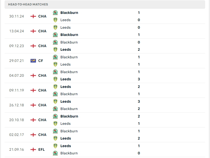 Lịch sử thi đấu của Leeds Utd vs Blackburn Rovers