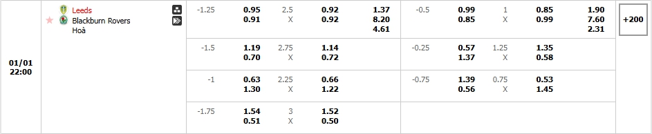 Bảng tỷ lệ kèo bóng đá trận đấu Leeds Utd vs Blackburn Rovers