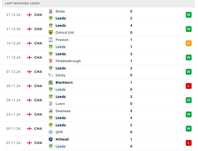 Leeds Utd vừa có chiến thắng trước Stoke City, đây là trận bất bại thứ 5 liên tiếp của họ, trong đó có 4 chiến thắng và 1 hòa, sau 23 lượt trận Leeds Utd mang về 14 chiến thắng, 6 hòa và 3 thất bại, có được 48 điểm và đang dẫn đầu trên BXH, hàng công của Leeds Utd có cho mình 43 bàn thắng cùng hàng thủ nhận 15 bàn thua, 3/5 trận vừa qua của Leeds Utd khép lại không quá 3 bàn, trên sân nhà của mình Leeds Utd có được 29 bàn thắng cùng hàng thủ nhận 6 bàn thua sau 12 trận đấu.