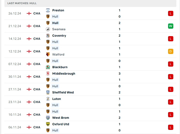 Hull City vừa nhận thất bại trước Preston, đây là trận thua thứ 12 của họ sau 23 trận đấu, cùng với 4 chiến thắng và 7 thất bại, có cho mình 19 điểm và đang xếp vị trí thứ 22 trên BXH, một vị trí trong nhóm cầm đèn đỏ, hàng công của Hull City mang về 21 bàn thắng cùng hàng thủ nhận 32 bàn thua, 2/3 trận vừa qua của Hull City khép lại từ 3 bàn thắng trở lên, trên sân nhà của mình Hull City có cho mình 11 bàn thắng cùng hàng thủ nhận 14 bàn thua.